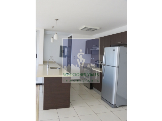 • Cocina con extractor de olores, refrigeradora, gabinetes de piso y aéreos, top de cuarzo